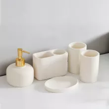 Crafted from high-quality ceramic, each piece in this set is made to be sturdy, durable and easy to clean. The collection includes a lotion or soap dispenser, toothbrush holder, mouthwash cup and soap dish — everything you need to keep essentials neatly in place. With compact sizing that suits countertops of all sizes, the pieces typically measure between 3 to 5 inches in height, making them perfect for everyday use without cluttering your space.
