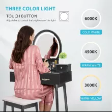 Imagine applying your makeup under the perfect lighting conditions every single day. Our vanity set features a lighted mirror with three adjustable settings—cold, natural, and warm light—to simulate various environments, ensuring your makeup looks impeccable in any setting. The touch-sensitive control allows you to adjust brightness effortlessly, protecting your eyes while providing precision in makeup application.