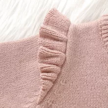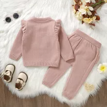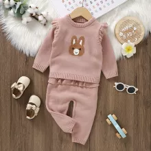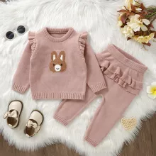 Wrap your baby girl in comfort and charm with this pink knitted pullover and pants set, designed to keep her warm and stylish during the cooler months. Made from soft acrylic worsted fabric, this outfit provides a gentle, cozy feel against delicate skin while offering the perfect amount of stretch for active little explorers. Its sweet ruffle details and playful cartoon pattern make it a delightful choice for everyday wear, photoshoots, family outings, or snuggly days at home.