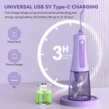 Transform your daily oral care routine with this sleek and effective portable dental water flosser. Designed to deeply clean between teeth and along the gum line, it removes food particles and plaque that traditional brushing often misses. With its elegant purple finish, it’s not only functional but stylish enough to take anywhere you go.