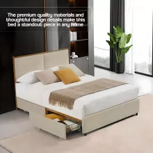 This bed epitomizes effortless elegance with its sleek design and luxurious backrest. The storage drawers are a thoughtful addition, providing ample space for storing essentials. The bed's construction is robust and durable, offering a stable and comfortable foundation for a good night's sleep. It's a perfect blend of form and function.