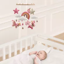 Bring softness, color, and calm into your baby girl’s space with this beautifully designed butterfly crib mobile. Delicate rainbow butterflies float gently above the crib, creating a peaceful and dreamy atmosphere that instantly warms the nursery. Designed to soothe and delight, this mobile adds a charming decorative accent while supporting your baby’s early sensory development.