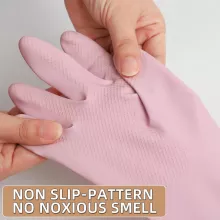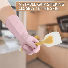 Our gloves are made to give you the perfect balance of durability and comfort. With a snug pull-on closure, they stay in place while you work, and the textured non-slip grip ensures you can hold wet or soapy dishes securely. The gloves are designed with long-lasting rubber and lined with soft non-woven material, making them gentle on your skin while standing up to repeated use. They measure long enough to cover your wrists, keeping water and detergents out as you clean.