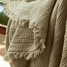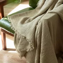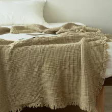 Wrap yourself in everyday comfort with this beautifully crafted solid color cotton tassel blanket. Made from four-layer muslin gauze cotton, it feels soft, breathable, and gently textured against the skin. The pleated design and hand-finished tassels on all four sides add a relaxed yet refined look that instantly elevates any space. Whether draped over a sofa, layered at the end of a bed, or used as a light cover, this blanket blends function with effortless style.