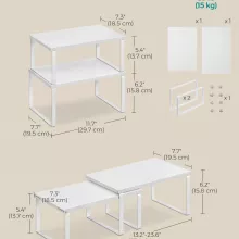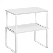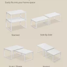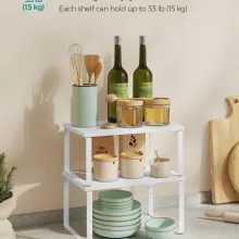 Create calm out of kitchen chaos with this set of two stackable, adjustable counter shelves. Designed to give your cooking space instant order, these sleek organizers keep your everyday essentials—spice jars, cans, utensils, containers, even small cookbooks—neatly displayed and always within reach. With one shelf slightly smaller than the other, you can stack, nest, separate, or arrange them in an L-shape to perfectly fit your counter, cabinet, or pantry layout.