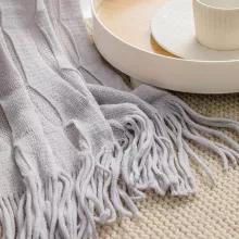 Discover the perfect blend of softness, warmth, and style with this ultra-soft jacquard knit tassel throw blanket. Crafted from 100% acrylic, it offers the sumptuous feel of cashmere without the high maintenance. Its solid, plain-dyed design and elegant tassel edges make it a beautiful addition to any room, whether draped across your sofa, layered on your bed, or used as a cozy wrap during quiet evenings.