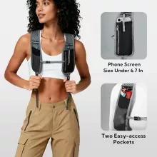 Inspired by running vest designs, this backpack includes two convenient pockets on each shoulder strap. Each pocket can hold a phone up to 6.7 inches, plus cards, cash, or keys. Breathable mesh straps help reduce shoulder fatigue, while reflective details add visibility during early mornings or low-light conditions.