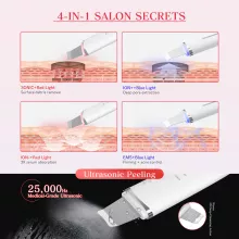 Transform your skincare routine with this 4-in-1 Ultrasonic Skin Scrubber. Designed to deeply cleanse, exfoliate, and rejuvenate your skin, this sleek facial tool brings spa-quality treatments right to your home. It uses advanced 25,000Hz ultrasonic vibrations to gently remove dirt, oil, and blackheads, while its ion and EMS functions boost absorption of skincare products and improve skin elasticity. Whether you want to brighten dull skin, reduce fine lines, or simply keep your complexion clear, this skin scrubber is your go-to solution.