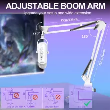 The included adjustable boom arm gives you full control over mic placement. With a sturdy scissor design that extends up to 30.8 inches and rotates 360°, you can position it exactly where you need it. The desk clamp securely attaches to surfaces up to 1.8 inches thick, saving space and keeping your setup clean and organized. Plus, the foam windscreen reduces plosive sounds for smoother audio output.