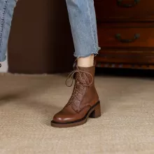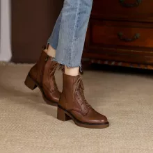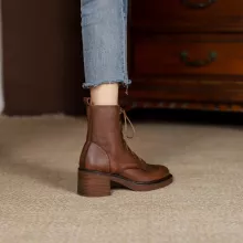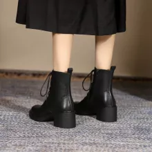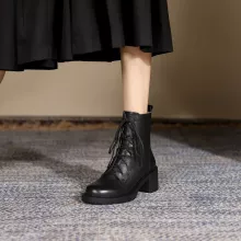 Elevate your winter wardrobe with these genuine leather ankle boots designed to blend retro charm with modern comfort. Crafted from premium cowhide leather, these boots feature a classic round toe and lace-up design that add an effortless touch of elegance to any outfit. The 6-inch high thick square heel and subtle platform provide height and stability, making them perfect for both daily wear and evenings out.