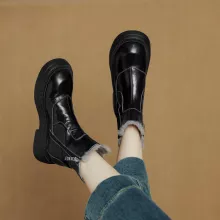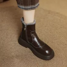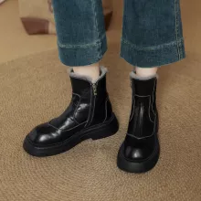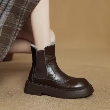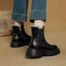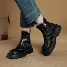 These boots feature a round toe for natural comfort, a convenient zip closure, and a secure ankle-height fit that keeps warmth inside. The wool lining and wool insole wrap your feet in cozy softness, while the handmade platform design adds stability and charm. Split leather gives a rich, textured look that ages beautifully, and the clean solid pattern makes them easy to pair with everything—from jeans to dresses.