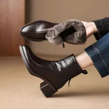 These ankle-height snow boots are thoughtfully made to provide dependable warmth without sacrificing style. The genuine leather upper adds durability, while the wool insole and lining offer natural insulation to protect your feet from winter chill. The 2.1 in. (5.5 cm) high square heel adds height without compromising comfort, making them ideal for all-day wear. A smooth zipper closure ensures quick and easy on-and-off, and the sturdy rubber outsole provides reliable grip on cold-weather surfaces.