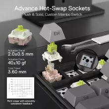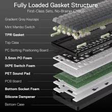 - Custom Mint Mambo Switch: Enjoy a luxurious typing experience with the custom linear switches. The thick-lubed design ensures silky smooth and comfortable keypresses, combined with the gasket form factor for a cushioned, satisfying feel.