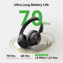Designed for long listening sessions, the lightweight on-ear build—just about 7 oz—pairs breathable memory-foam cushions with air-weave fabric for exceptional comfort. Enjoy up to 70 hours of playback with noise canceling off, or power through 40+ hours with ANC on. Need a quick top-up? Just 10 minutes of charging gives you up to 5 hours of use through the universal USB-C port.