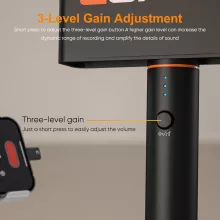 One-touch noise reduction instantly cuts unwanted background sounds, making it ideal for busy streets, events, or crowded rooms. The three-level gain adjustment lets you fine-tune your audio at any time, ensuring balanced volume and clear vocal presence in every situation.