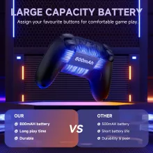Equipped with Hall Effect joysticks, this controller eliminates drift issues and guarantees flawless accuracy. Customizable RGB lighting with 9 dynamic effects lets you match your controller to your mood or setup. A powerful 800mAh rechargeable battery delivers 8–16 hours of gameplay, while the one-tap wake-up feature gets you back into the action instantly.