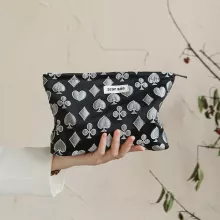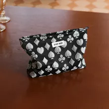 Keep your beauty essentials stylishly organized with this elegant black cosmetic bag featuring a playful love card design. Designed for modern women on the go, this large-capacity makeup organizer combines fashion with function. Its sleek look makes it perfect for tossing in your handbag, suitcase, or carrying solo as a trendy accessory.