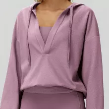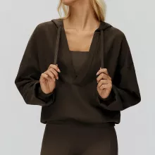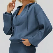 Crafted from a premium blend of cotton, polyester, and spandex, this hooded jacket offers the perfect balance of softness, stretch, and durability. The polyester-cotton fleece fabric feels warm yet breathable, making it suitable for both indoor workouts and outdoor adventures. The loose fit allows unrestricted motion, while the V-neck design adds a flattering, feminine touch that stands out from typical sportswear.
