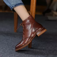Made with genuine cow leather, the upper part of these boots offers a premium feel and long-lasting durability. The soft short plush lining and insole provide a warm, cushioned embrace, perfect for chilly days. With a sturdy rubber outsole and a stable square block heel (1.2 – 2 inches), you’ll enjoy both traction and comfort with every step. The lace-up closure ensures a snug fit, while the classic round toe design adds a touch of timeless elegance.