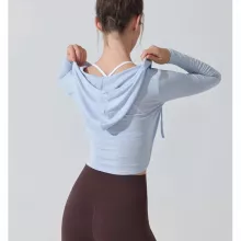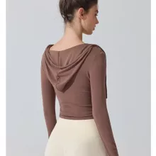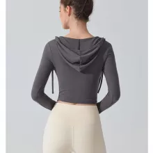 This versatile top is made for movement in every season. The long sleeves offer light coverage for spring and fall, while its breathable and anti-pilling fabric keeps you comfortable even during summer heat or winter warm-ups. The slim, streamlined fit allows full mobility without bulk, and its lightweight hood adds a sporty touch while giving you optional coverage outdoors. With its simple solid colors—gray, coffee, blue, and cream—this piece pairs effortlessly with any activewear wardrobe.