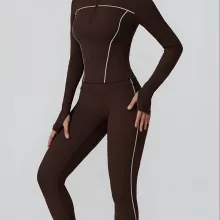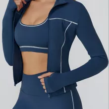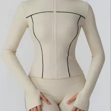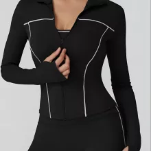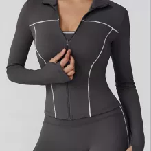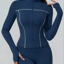 Crafted from high-quality knit fabric, this jacket combines durability with breathable comfort. Its slim-fit silhouette enhances your figure while allowing maximum stretch for dynamic workouts. The long sleeves offer extra coverage and protection against cool breezes, making it ideal for both indoor and outdoor activities. With its smooth zip-up design and sporty details, this jacket is as stylish as it is functional.