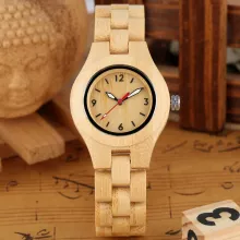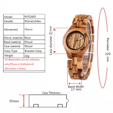 This watch combines natural materials with practical design. The smooth wooden case offers a warm, organic feel, while the quartz movement ensures accurate timekeeping. Its round dial with Arabic numerals makes it easy to read at a glance. The lightweight wooden bangle band provides comfort all day long without compromising durability.