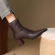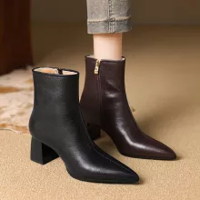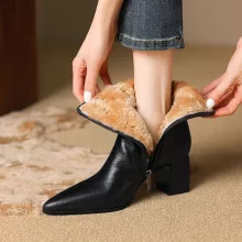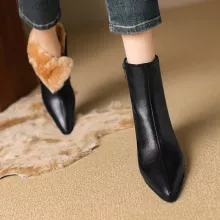 Step into the cold season with confidence and style. These fashionable wool-warm leather ankle boots are designed for women who love sleek looks without sacrificing comfort. Crafted from genuine cow leather and lined with plush wool, they deliver impressive warmth and a refined silhouette that enhances any winter outfit. With a chic pointed toe and a stable 2.3 in high heel, these boots blend elegance and practicality for everyday wear.