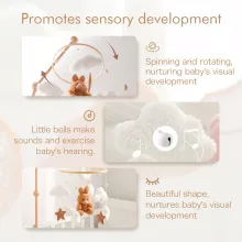 This crib mobile is crafted from smooth, natural wood and finished with soft, stuffed elements that are safe and gentle for babies. The plush teddy bear sways softly above, capturing attention without overstimulation. Subtle movement and sound help soothe babies during rest time and keep them calmly engaged during awake moments. It is best used from the newborn stage through toddler years, making it a lasting and meaningful addition to your baby’s early environment.