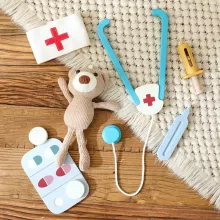This beautifully designed wooden medical set includes a stethoscope, thermometer, syringe, and other essential doctor tools—all sized just right for small hands. Each piece is made from durable, child-safe wood and features smooth edges for safe handling. The included carry case keeps everything organized and makes it easy to take the fun on the go.